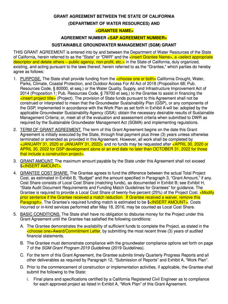 GRANT AGREEMENT BETWEEN THE STATE OF CALIFORNIA (DEPARTMENT OF WATER RESOURCES) AND GRANTEE NAME AGREEMENT NUMBER SAP AGREEMENT NUMBER SUSTAINABLE GROUNDWATER MANAGEMENT (SGM) GRANT THIS GRANT AGREEMENT