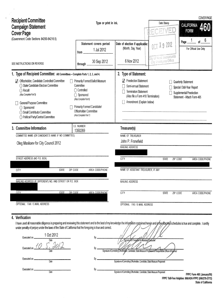 COVER Percipient Committee Campaign Statement Cover Palette or print in ink. Date Stamp(Government Code Sections 84200842165)Statement covers period1 Jul 2012 from SEE INSTRUCTIONS ON REVERSE1. Type