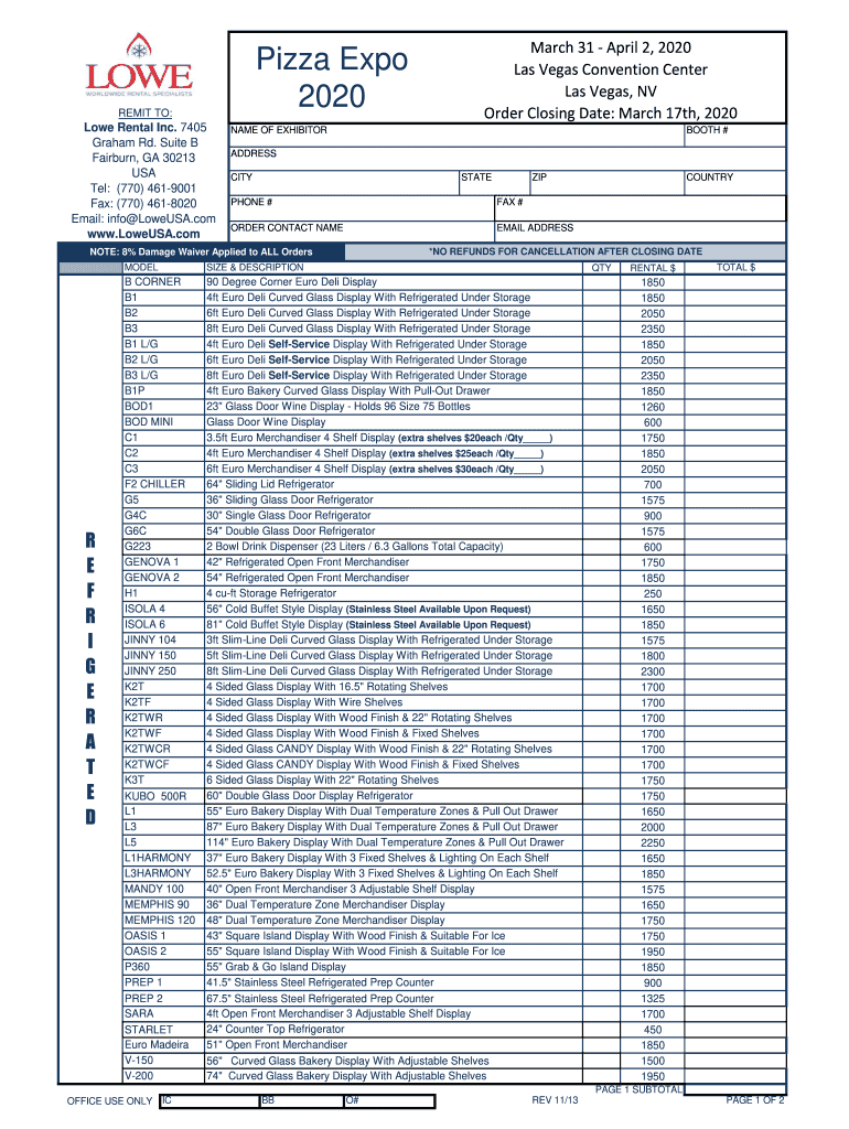 Pizza Expo 2020REMIT TO:Lowe Rental Inc. 7405 Graham Rd. Suite B Fair burn, GA 30213 USA Tel: (770) 4619001 Fax: (770) 4618020 Email: info LoweUSA.com www.LoweUSA.comNAME OF EXHIBITORBOOTH #ADDRESS