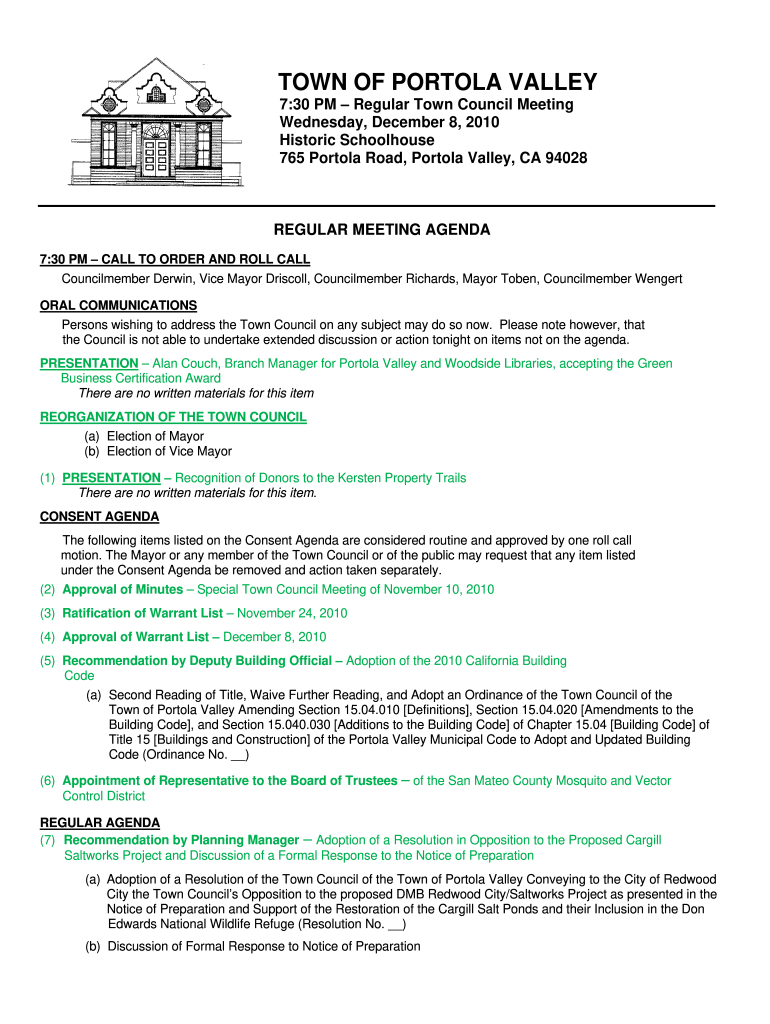TOWN OF TORTOLA VALLEY 7:30 PM Regular Town Council Meeting Wednesday, December 8, 2010, Historic Schoolhouse 765 Tortola Road, Tortola Valley, CA 94028REGULAR MEETING AGENDA 7:30 PM CALL TO ORDER