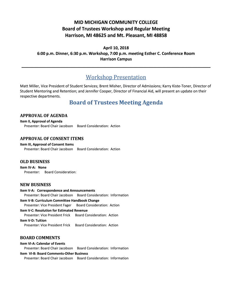 MID MICHIGAN COMMUNITY COLLEGE Board of Trustees Workshop and Regular Meeting Harrison, MI 48625 and Mt. Pleasant, MI 48858 April 10, 2018 6:00 p.m. Dinner, 6:30 p.m. Workshop, 7:00 p.m. meeting Esther