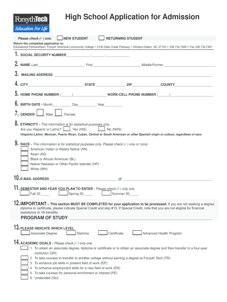 High School Application for AdmissionPlease check (P) one. NEW STUDENT RETURNING STUDENTReturn the completed application to: Educational Partnerships Forsyth Technical Community College 2100 Silas