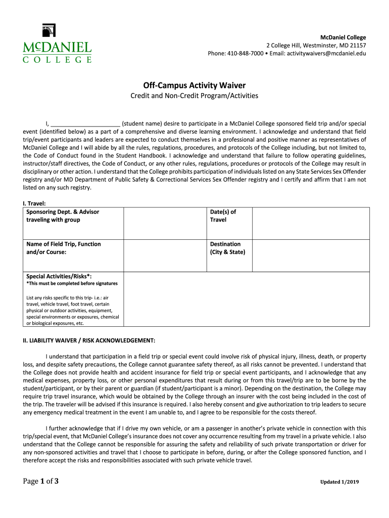 The McDaniel College 2 College Hill, Westminster, MD 21157 Phone: 4108487000 Email: activity waivers McDaniel.eduOffCampus Activity WaiverCredit and Noncredit Program/Activities I, (student name)