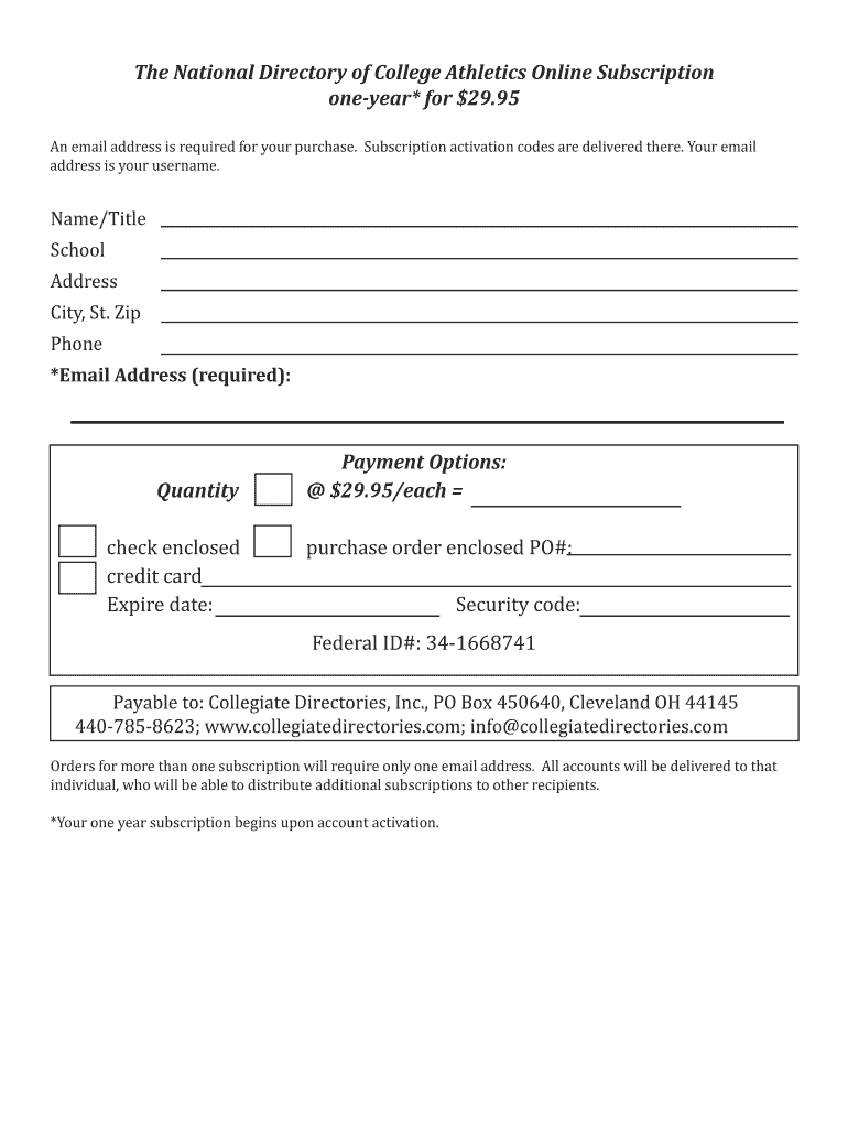 The National Directory of College Athletics Online Subscription one year* for $29.95 An email address is required for your purchase. Subscription activation codes are delivered there. Your email address