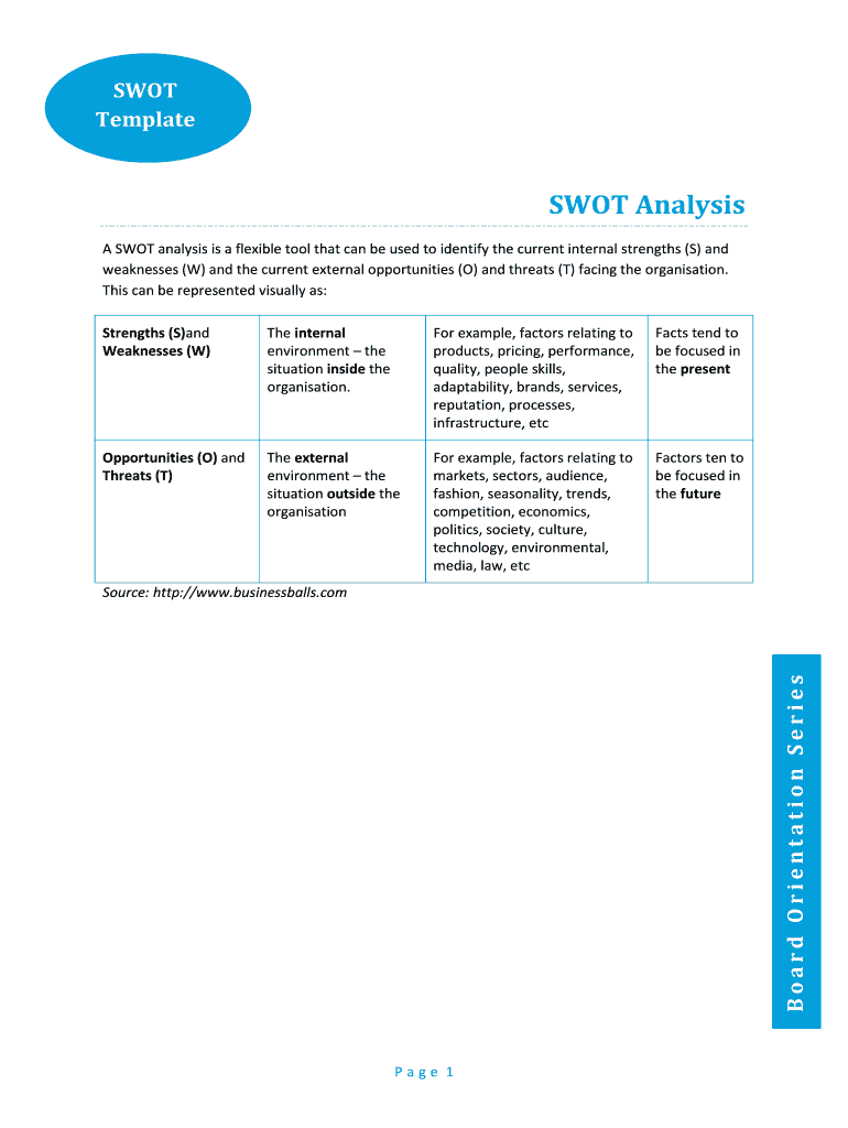 The SWOT Analysis Template is a business form used by organizations to identify internal strengths and weaknesses, along with external opportunities and threats.