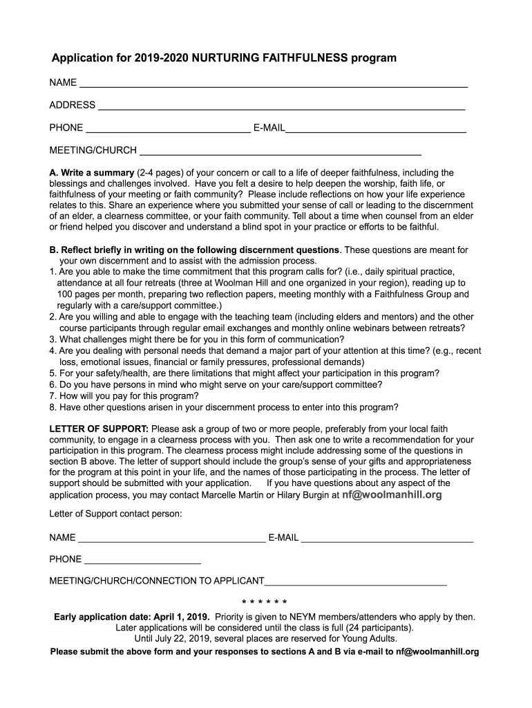 Application for 20192020 NURTURING FAITHFULNESS program NAME ADDRESS PHONE EMAIL MEETING/CHURCH A. Write a summary (24 pages) of your concern or call to a life of deeper faithfulness, including the