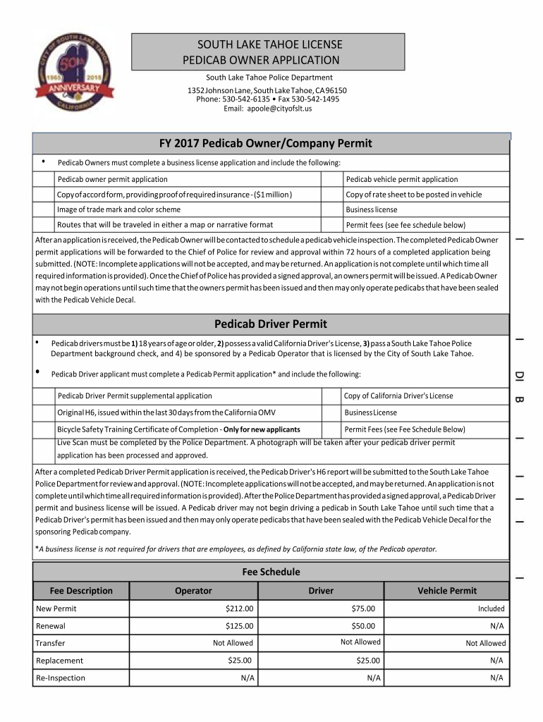 SOUTH LAKE TAHOE LICENSE PEDICAB OWNER APPLICATION South Lake Tahoe Police Department 1352 Johnson Lane, South Lake Tahoe, CA 96150 Phone: 5305426135 Fax 5305421495 Email: Poole cityofslt.USF 2017
