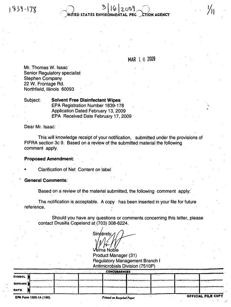 Iii '; 'o,). ? (P, 2 “)NOTED STATES ENVIRONMENTAL PRG TON AGENCY MAR 1 6 2009 Mr. Thomas W. Isaac Senior Regulatory specialist Stephen Company 22 W. Frontage Rd. Northfield, Illinois 60093 Subject:Solvent