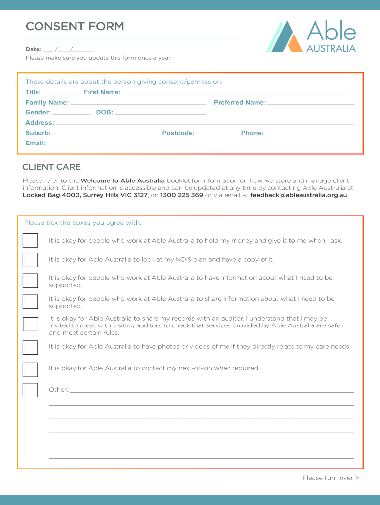 CONSENT FORM Date: / / Please make sure you update this form once a year. These details are about the person giving consent/permission. Title:First Name:Family Name: Gender:Preferred Name: DOB:Address: