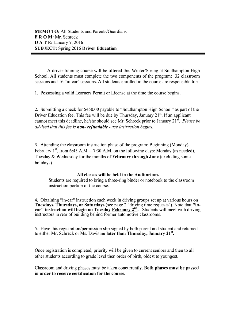 MEMO TO: All Students and Parents/Guardians F R O M: Mr. Check D A T E: January 7, 2016, SUBJECT: Spring 2016 Driver Education driver training course will be offered this Winter/Spring at Southampton