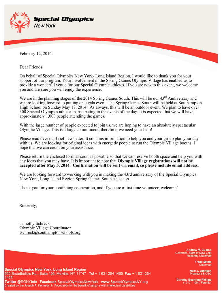 On behalf of Special Olympics New York Long Island Region, I would like to thank you for your