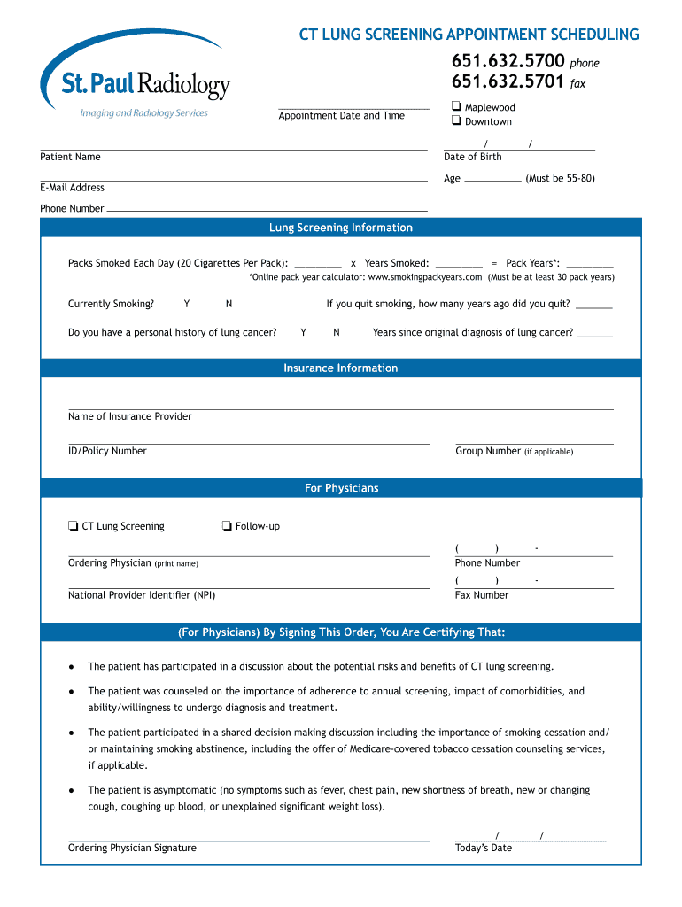 CT LUNG SCREENING APPOINTMENT SCHEDULING651.632.5700 phone 651.632.5701 fax Appointment Date and Impatient Name Email Address Maple wood o Downtown / Date of Birth/Age(Must be 5580)Phone Numbering