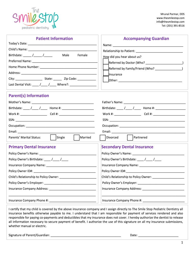 MrunalParmar, DDS www.thesmilestop.com info thesmilestop.com Tel:(201)3918516PatientInformationAccompanyingGuardianTodaysDate: Name: Childcare: RelationshiptoPatient: Birthdate: / / MaleFemaleHowd