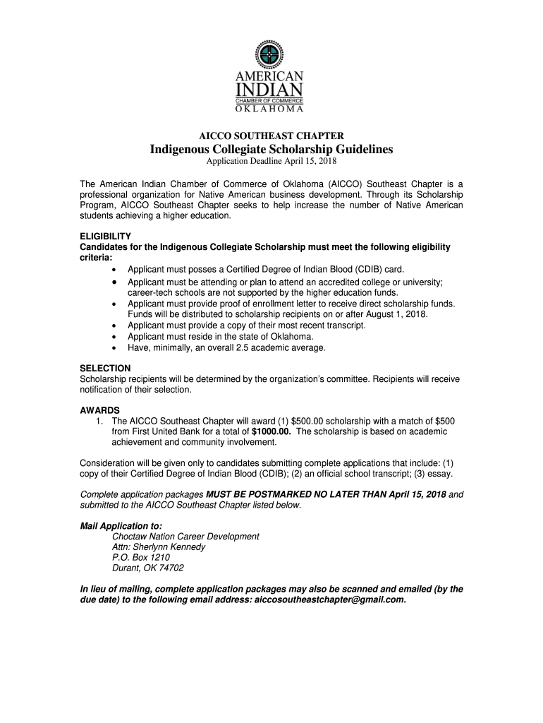 AI CCO SOUTHEAST CHAPTERIndigenous Collegiate Scholarship Guidelines Application Deadline April 15, 2018, The American Indian Chamber of Commerce of Oklahoma (AI CCO) Southeast Chapter is a professional