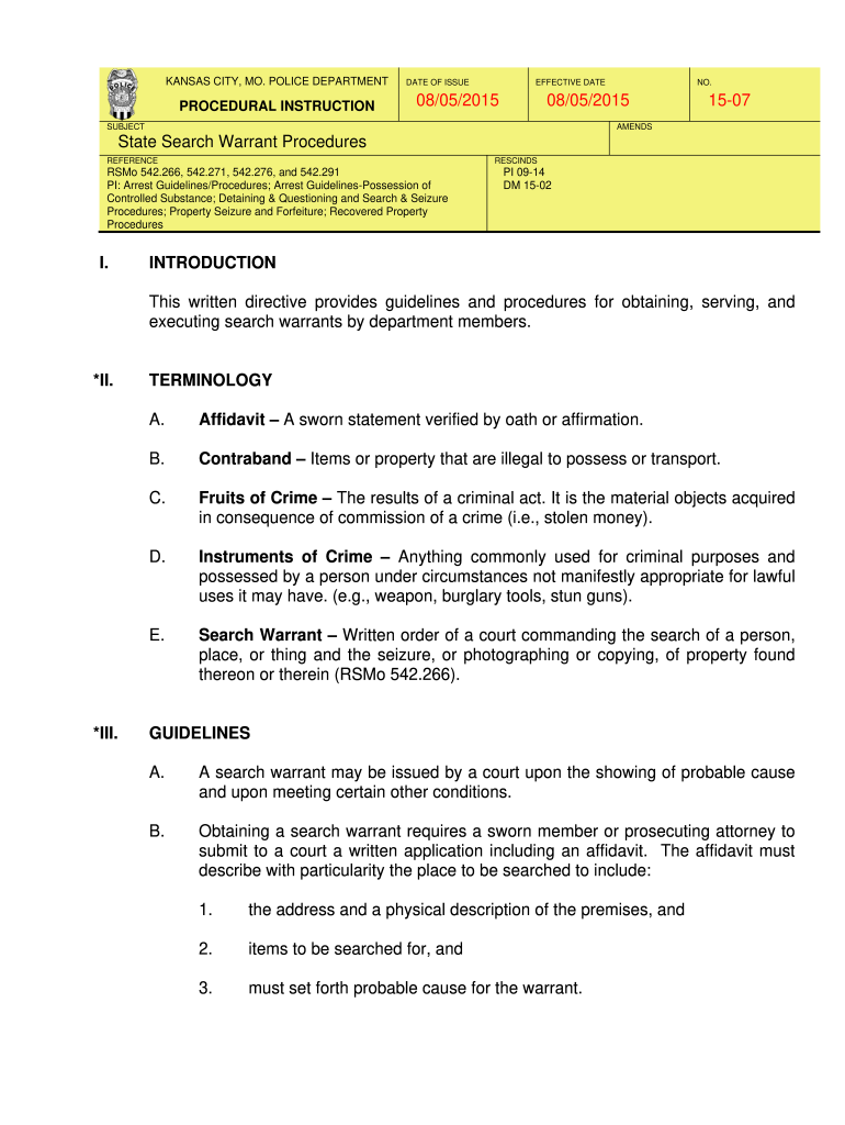 KANSAS CITY, MO. POLICE DEPARTMENTPROCEDURAL INSTRUCTIONAL OF ISSUEEFFECTIVE DATE08/05/2015NO.08/05/2015SUBJECT1507AMENDSState Search Warrant Procedures REFERENCERESCINDSRSMo 542.266, 542.271, 542.276,