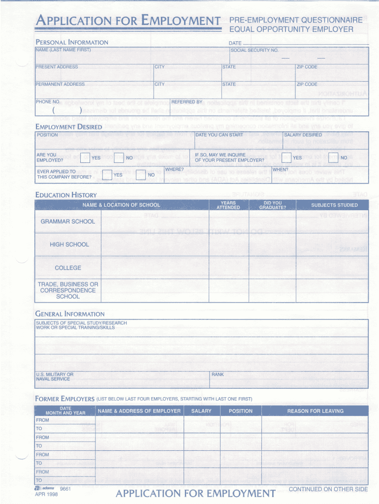 P R EEMPLOYMENTQUESTIONNAIRE ApplrcATroNFoRErvrprovMENT EQUAL OPPORTUNE EMPLOYER PrnsoNnlINroRmnnorrrDATE AME LAST NAME FIRST)SOCIALSECURITYNO.JRESENTADDRESSCITYJTATEZIP CODE, ERMANENTADDRESSctwJTATEZIPCODE,