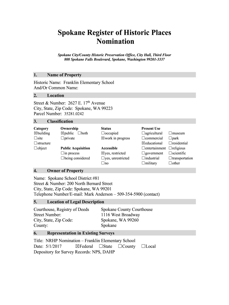 Spokane Register of Historic Places Nomination Spokane City/County Historic Preservation Office, City Hall, Third Floor 808 Spokane Falls Boulevard, Spokane, Washington 9920133371. Name of PropertyHistoric
