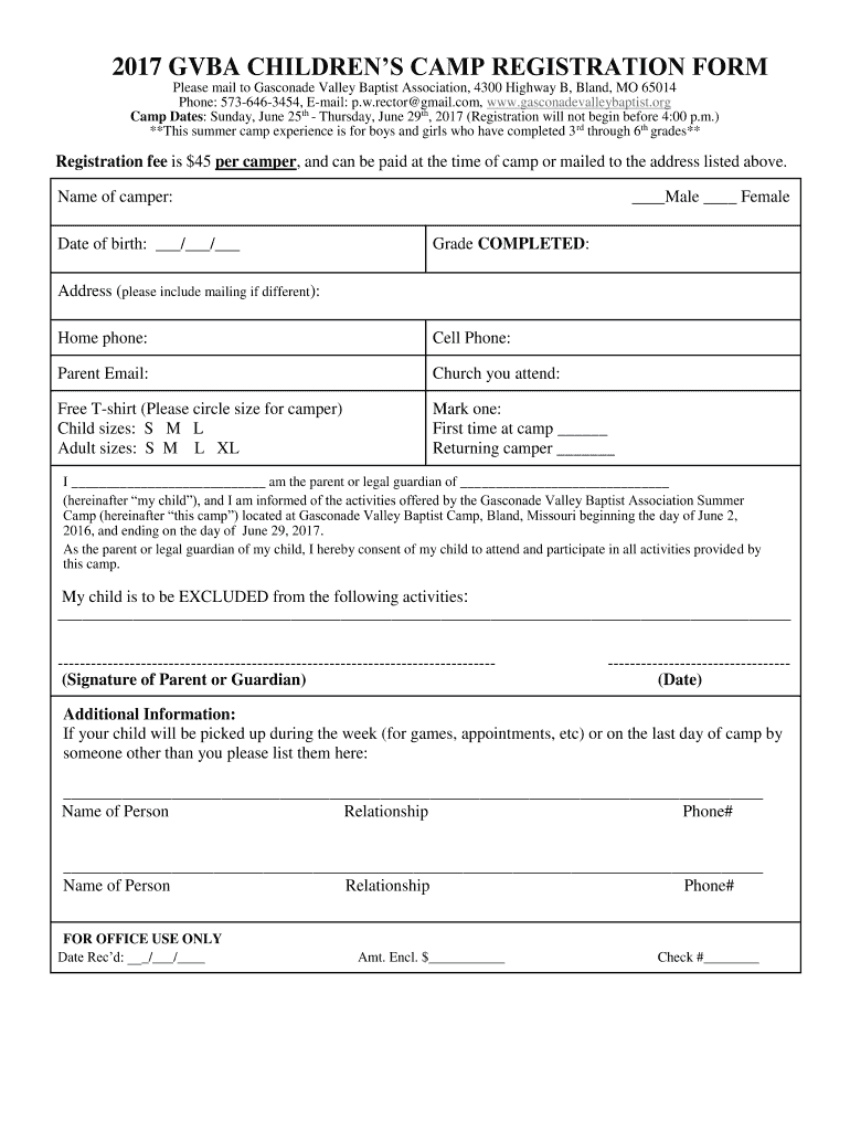 2017 GBA CHILDREN SCAMP REGISTRATION FORM Please mail to Gasconade Valley Baptist Association, 4300 Highway B, Bland, MO 65014 Phone: 5736463454, Email: p.w.rector gmail.com, www.gasconadevalleybaptist.org