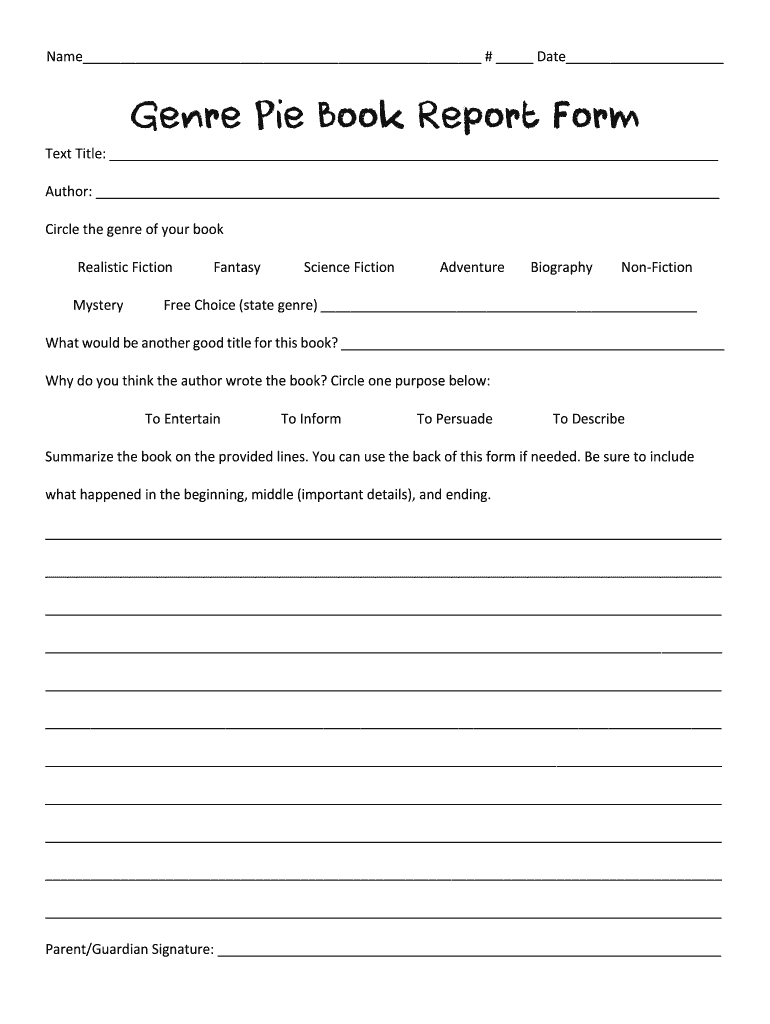 Name # Date Genre Pie Book Report Form Text Title: Author: Circle the genre of your book Realistic Fiction MysteryFantasyScience FictionAdventureBiographyNonFictionFree Choice (state genre) What would