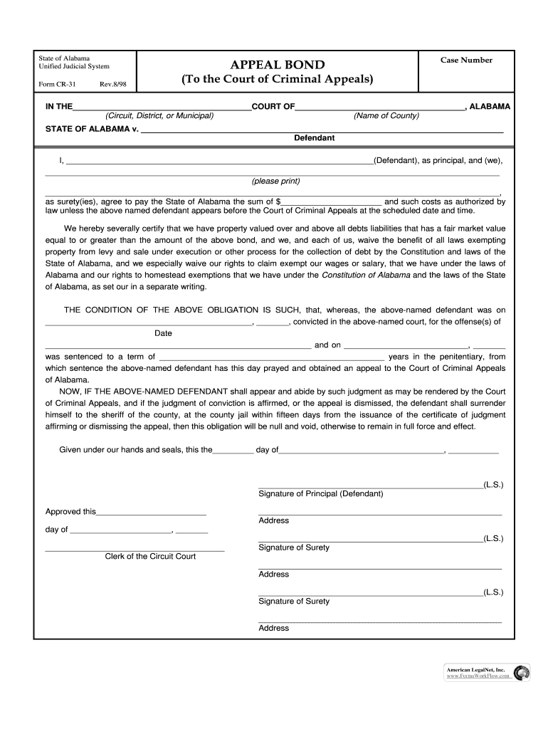 State of Alabama Unified Judicial System Form CR31Rev.8/98APPEAL BOND Case Number(To the Court of Criminal Appeals)IN THE COURT OF, ALABAMA (Circuit, District, or Municipal) (Name of County) STATE