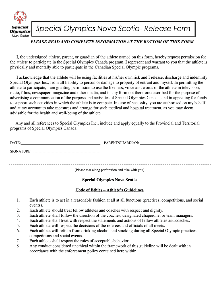 Special Olympics Nova Scotia Release Form