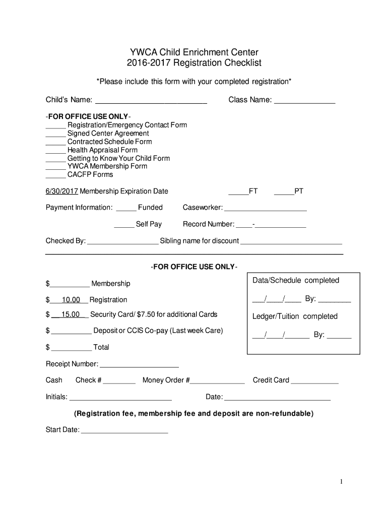 YWCA Child Enrichment Center 20162017 Registration Checklist *Please include this form with your completed registration* Child's Name: Class Name: FOR OFFICE USE ONLY Registration/Emergency Contact