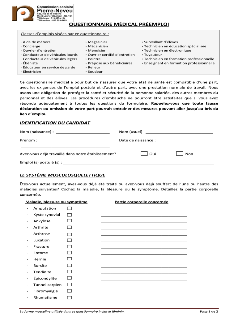 QUESTIONNAIRE MEDICAL EMPLOY Classes employs vises par CE questionnaire : Aide DE tears Concierge Courier dentition Conducted DE vehicles Lords Conducted DE vehicles lagers bite Decatur en service