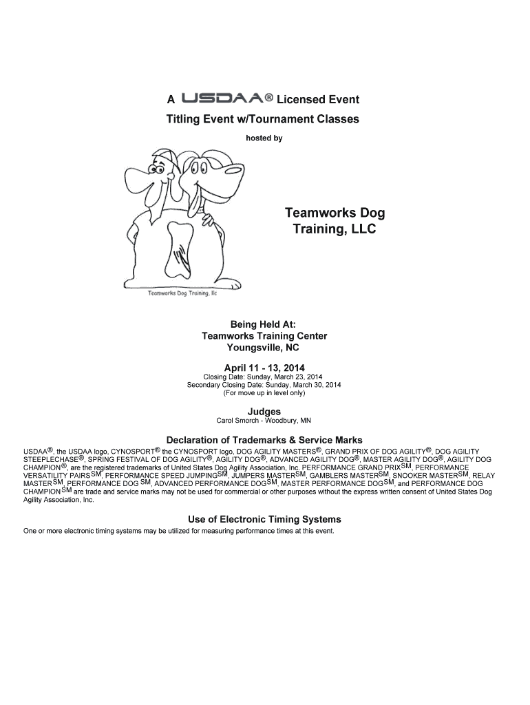 A Licensed Event Titling Event w/Tournament Classes hosted by Teamwork Dog Training, LLC Being Held At: Teamwork Training Center Louisville, NC April 11 13, 2014 ClosingDate:Sunday,March23,2014 SecondaryClosingDate:Sunday,March30,2014
