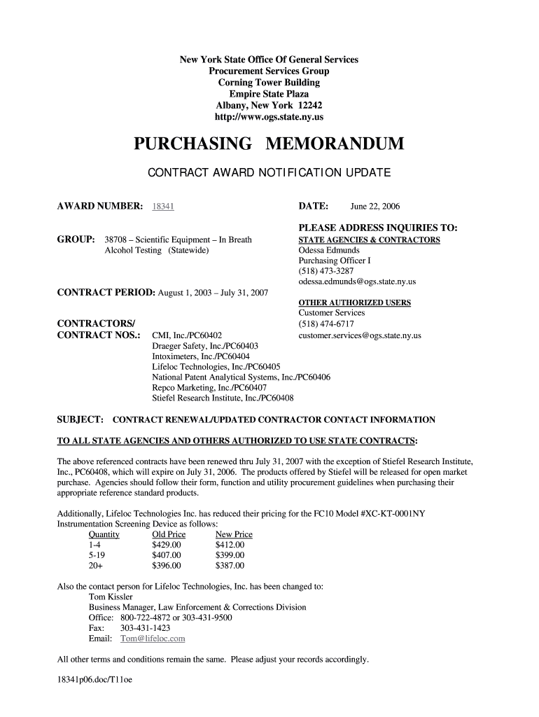 New York State Office Of General Services Procurement Services Group Corning Tower Building Empire State Plaza Albany, New York 12242 http://www.ogs.state.ny.usPURCHASING MEMORANDUM CONTRACT AWARD
