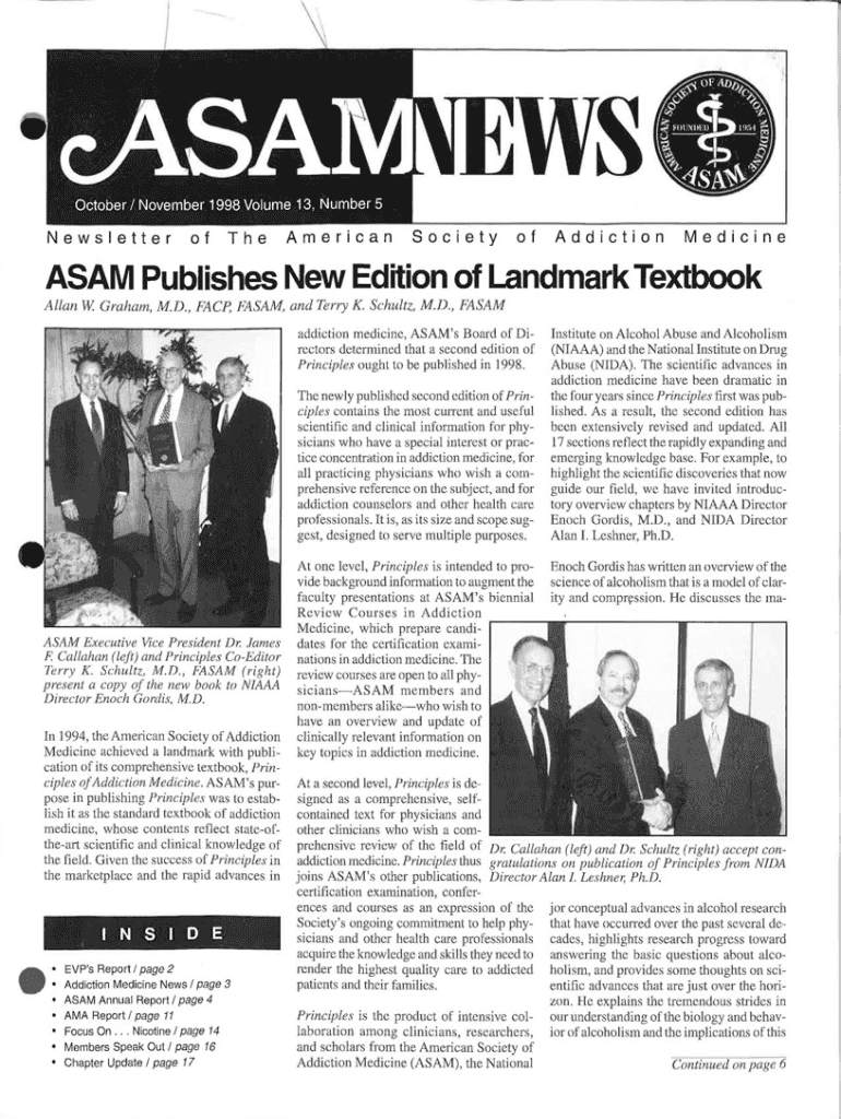 Newsletter of The American Society of Addiction Medicine ADAM Publishes New Edition of Landmark Textbook Allan W. Graham, M.D., FACE, FASM, and Terry K. Schultz, M.D., FASM addiction medicine, ADAM's