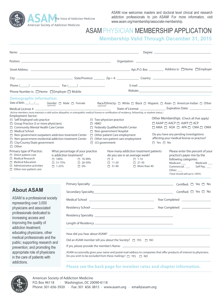 The ASAM Physician Membership Application serves as a vital tool for physicians seeking membership in the American Society of Addiction Medicine (ASAM). This organization plays a significant role in advancing the field of addiction medicine and supports professionals dedicated to this specialty. The membership application form outlines the information required to process your request effectively.