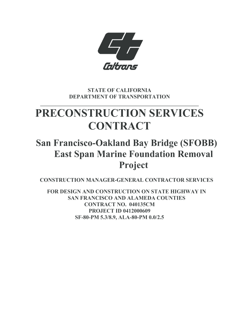 STATE OF CALIFORNIA DEPARTMENT OF TRANSPORTATION PRECONSTRUCTION SERVICESCONTRACTSan Francisco Oakland Bay Bridge (SFO BB) East Span Marine Foundation Removal Project CONSTRUCTION MANAGERGENERAL CONTRACTOR