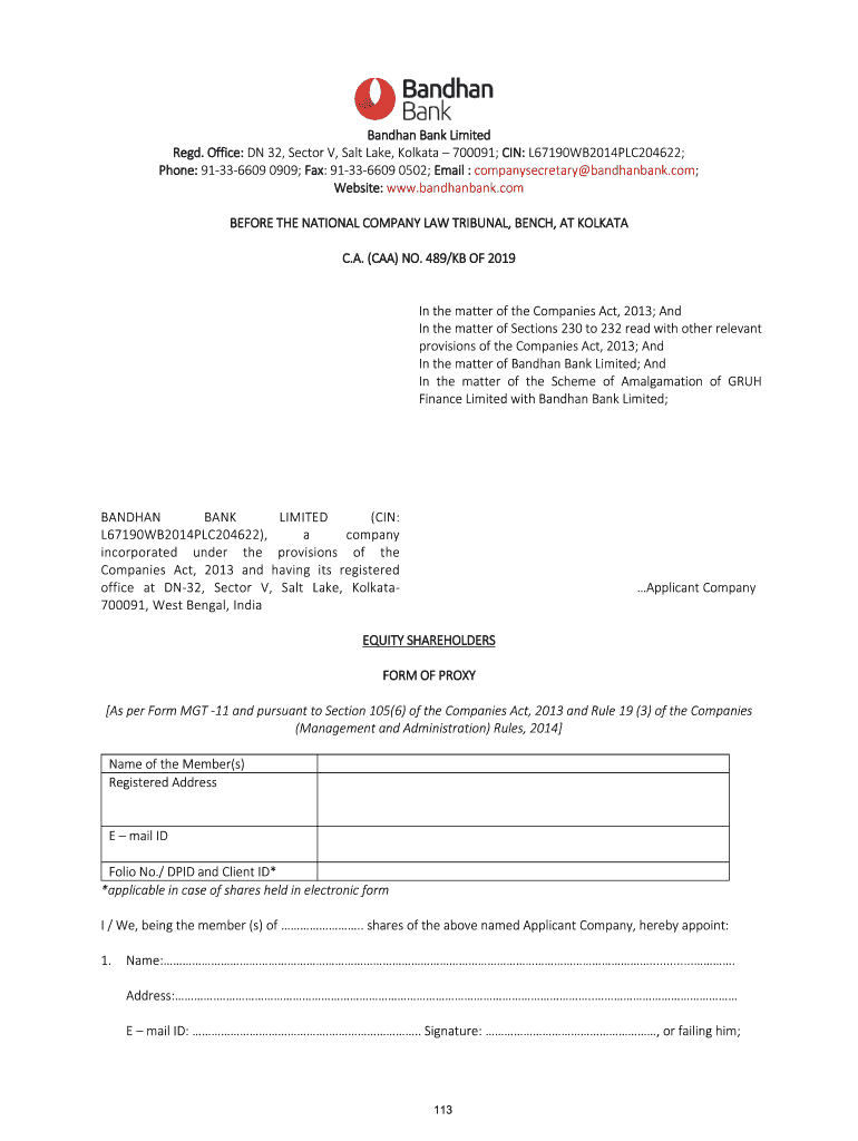 Andean Bank Limited Red. Office: DN 32, Sector V, Salt Lake, Kolkata 700091; IN: L67190WB2014PLC204622; Phone: 91336609 0909; Fax: 91336609 0502; Email : company secretary bandhanbank.com; Website: