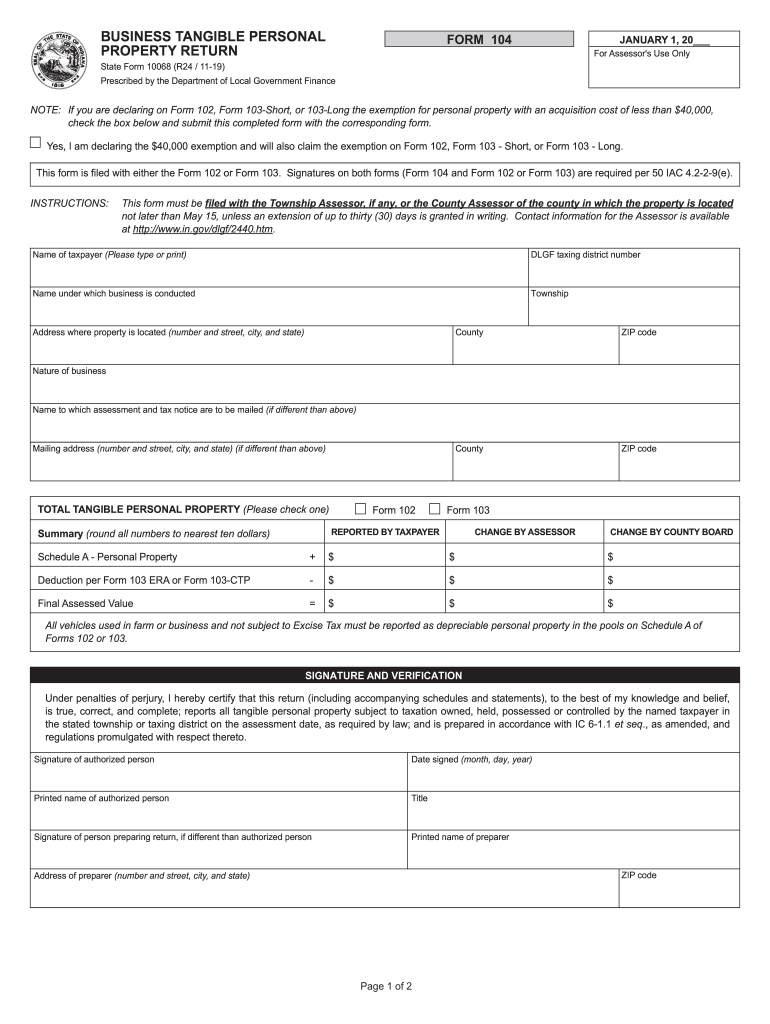 Reset Agribusiness TANGIBLE PERSONAL PROPERTY RETURNER 104JANUARY 1, 20 For Assessor's Use Onstage Form 10068 (R24 / 1119) Prescribed by the Department of Local Government FinanceNOTE: If you are