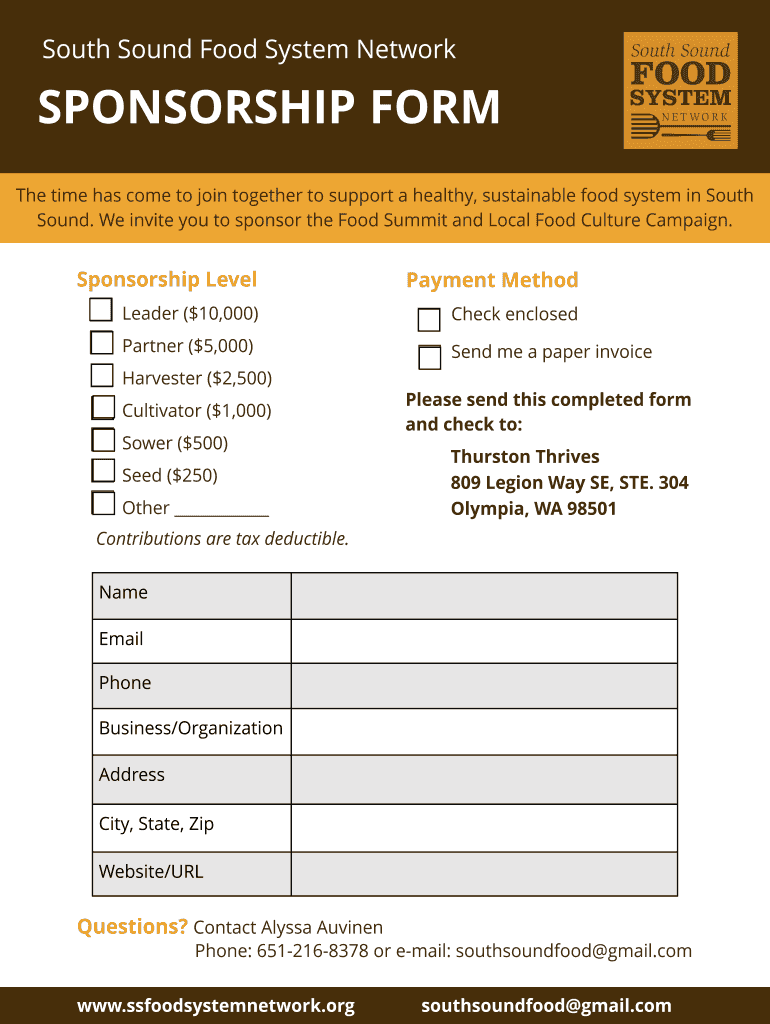 South Sound Food System NetworkSPONSORSHIP FORM The time has come to join together to support a healthy, sustainable food system in South Sound. We invite you to sponsor the Food Summit and Local