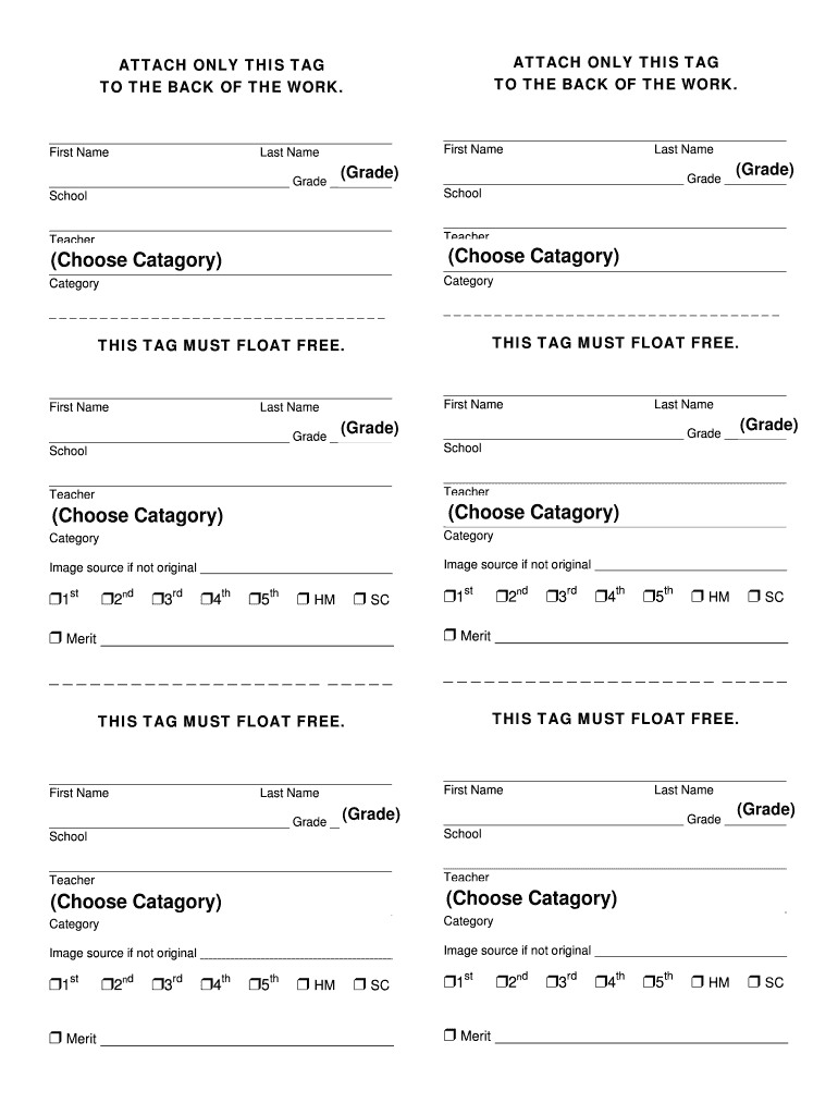 If the tag is not attached, the artwork may not be attributed correctly to the student. Ensure that the tag floats free and is securely affixed before displaying or submitting the artwork.