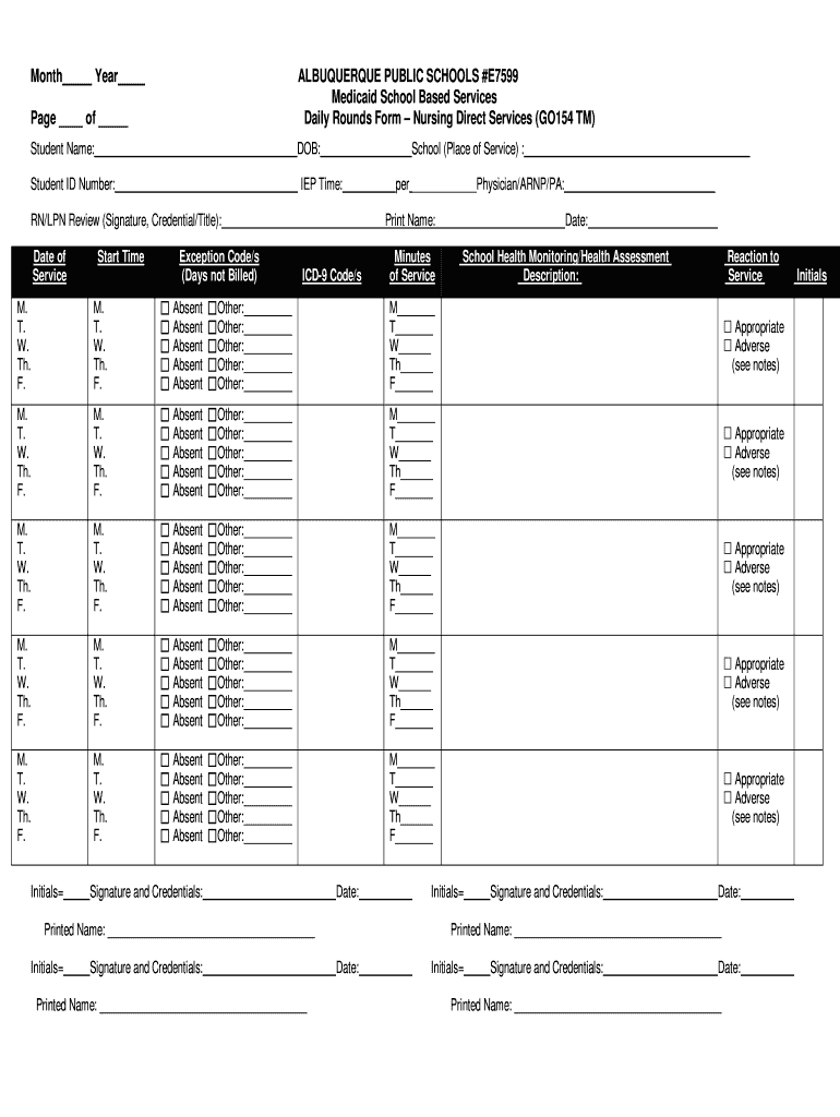 The Daily Rounds Form – Nursing Direct Services is a medical records release document used by healthcare providers to document nursing services provided to students in Albuquerque Public Schools.