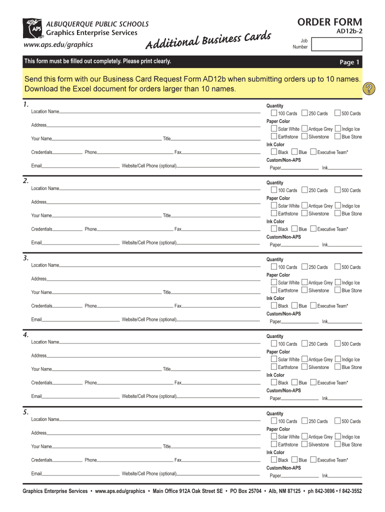 To submit an order, fill out the Albuquerque Public Schools Business Card Order Form and, if applicable, attach the Business Card Request Form AD12b for up to 10 names. Larger orders require an Excel document.