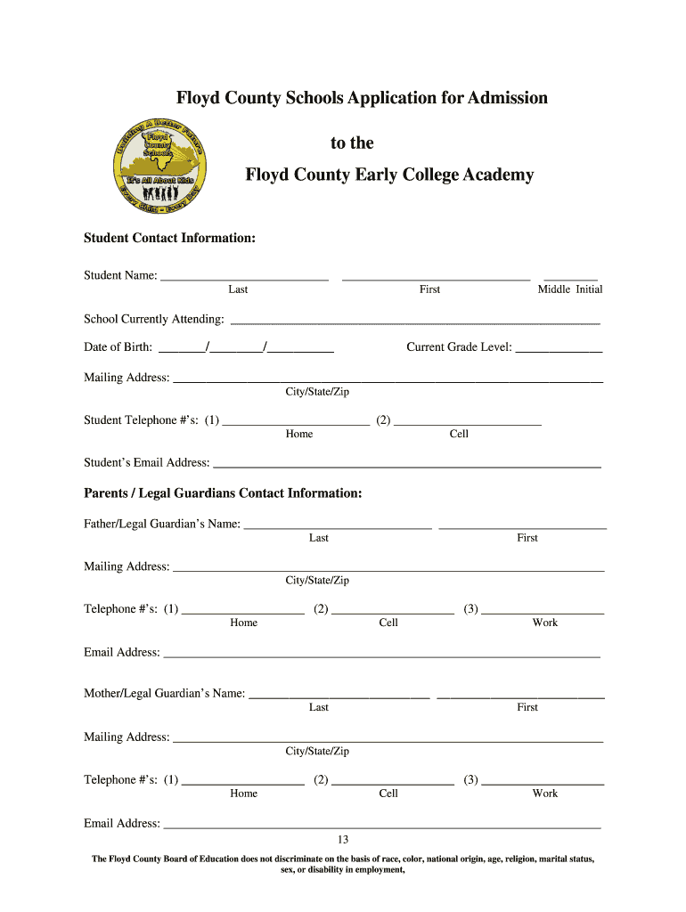 Floyd County Schools Application for Admission to the Floyd County Early College AcademyStudent Contact Information: Student Name: Last FirstMiddle InitialSchool Currently Attending: Date of Birth: