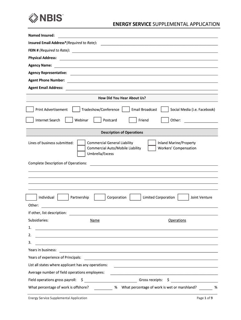 The Energy Service Supplemental Application is a crucial insurance application form tailored for energy service businesses. Its primary purpose is to gather detailed operational information that insurers require to assess risk and determine policy pricing. By accurately completing this form, businesses ensure that they provide comprehensive insights into their operations, facilitating better underwriting outcomes.