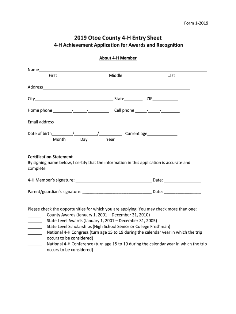 Form 120192019 Otoe County 4H Entry Sheet 4H Achievement Application for Awards and Recognition About 4H Member Name First Middle Last Address City State ZIP Home phone Cell phone Email address Date