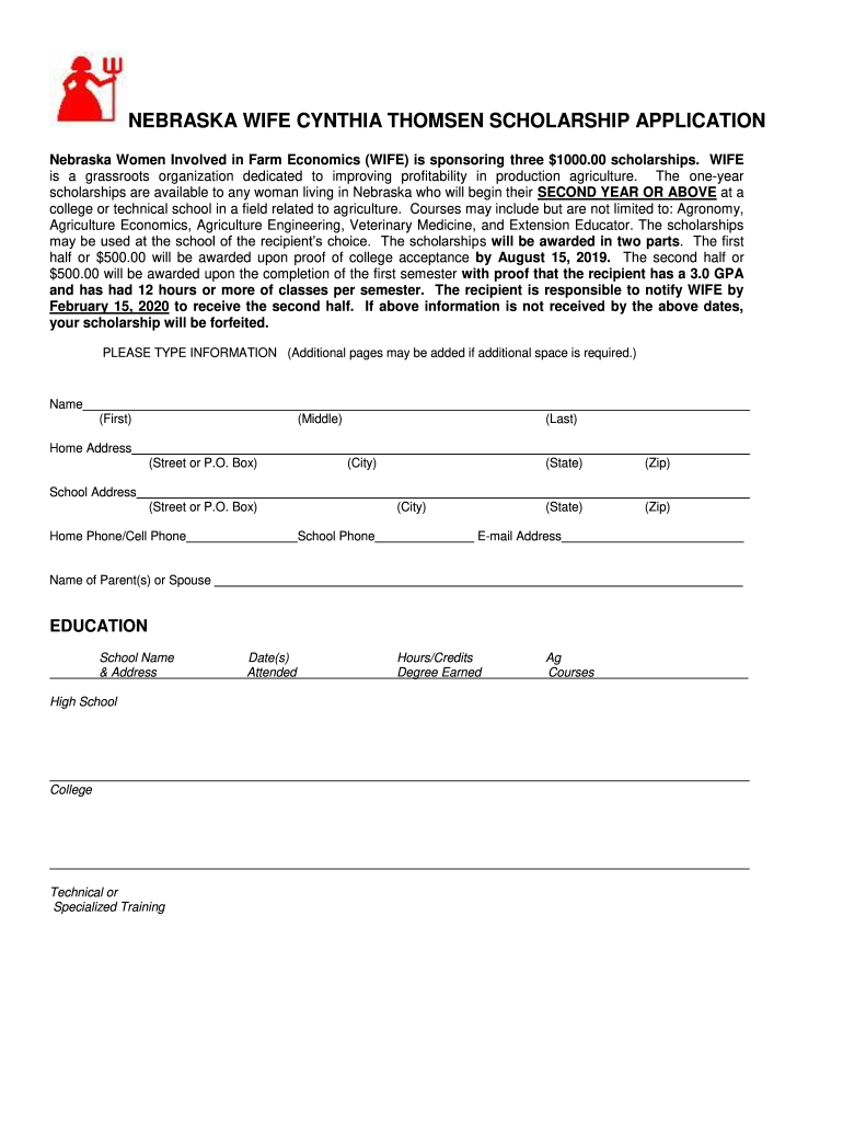 Nebraska Women Involved in Farm Economics (WIFE) is sponsoring three $1000.00 scholarships. WIFE