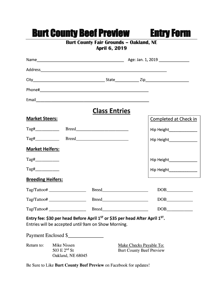 Burt County Beef Previewer Form Burt County Fair Grounds Oakland, NE April 6, 2019, Name Age: Jan. 1, 2019 Address City State Zip Phone# Email Class Entries Market Steers:Completed at Check INTG#