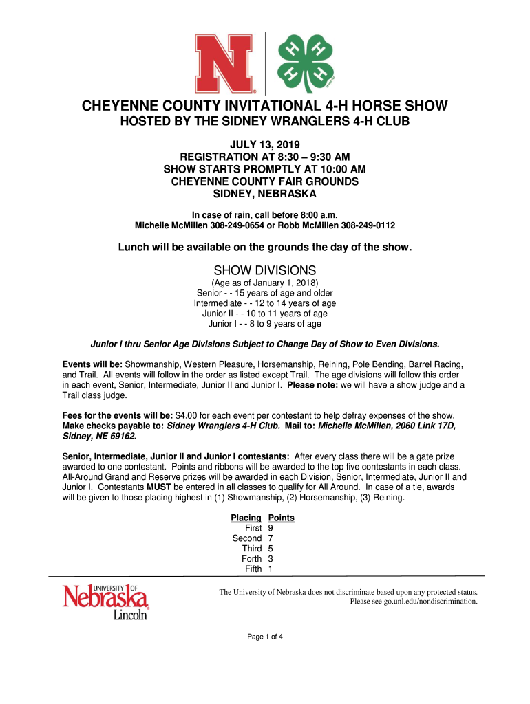 CHEYENNE COUNTY INVITATIONAL 4H HORSE SHOW HOSTED BY THE SIDNEY WRANGLERS 4H CLUB JULY 13, 2019, REGISTRATION AT 8:30 9:30 AM SHOW STARTS PROMPTLY AT 10:00 AM CHEYENNE COUNTY FAIR GROUNDS SIDNEY,