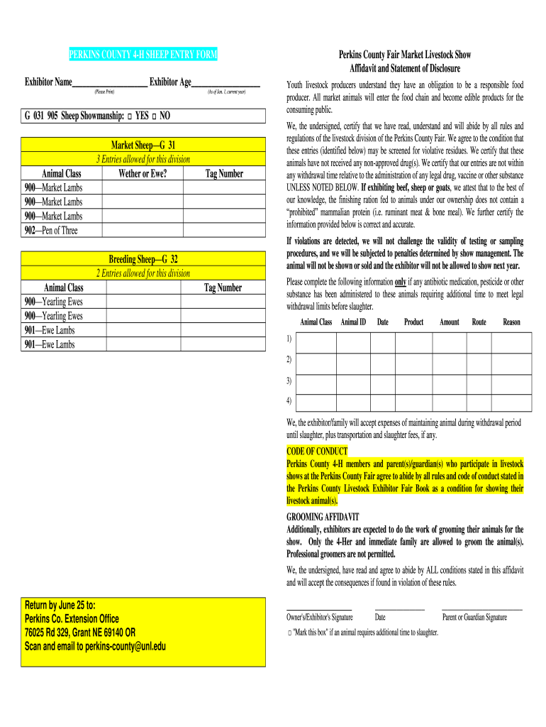 PERKINS COUNTY 4H SHEEP ENTRY FORM Perkins County Fair Market Livestock Show Affidavit and Statement of DisclosureExhibitor Name Exhibitor Age Youth livestock producers understand they have an obligation