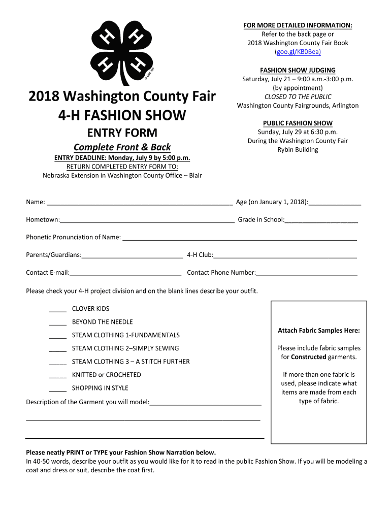 FOR MORE DETAILED INFORMATION: Refer to the back page or 2018 Washington County Fair Book (goo.gl/KB0Bea)2018 Washington County Fair 4H FASHION SHOW ENTRY FORM Complete Front & Basketry DEADLINE: