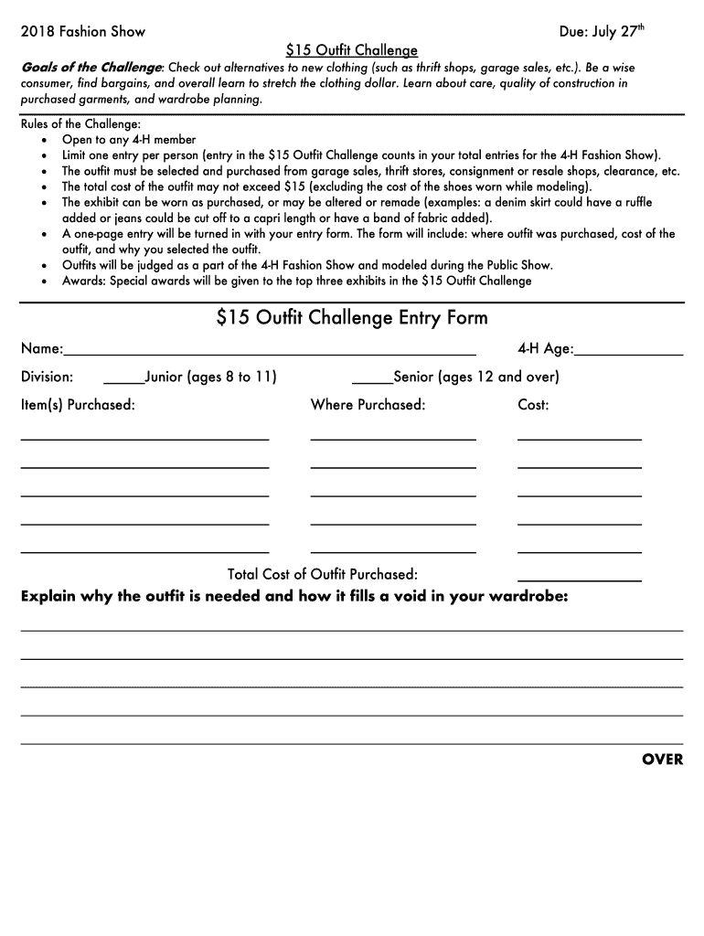 Due: July 27th2018 Fashion Show $15 Outfit ChallengeGoals of the Challenge: Check out alternatives to new clothing (such as thrift shops, garage sales, etc.). Be a wise consumer, find bargains, and