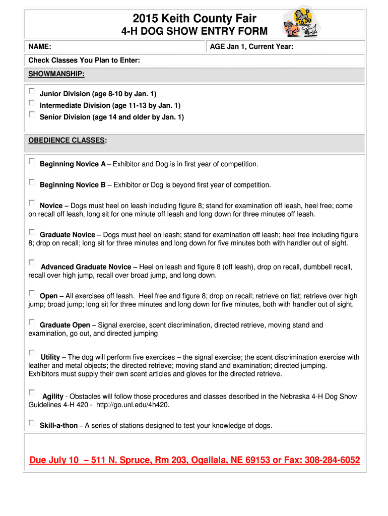 2015 Keith County Fair 4H DOG SHOW ENTRY FORM NAME:AGE Jan 1, Current Year:Check Classes You Plan to Enter: SHOWMANSHIP: Junior Division (age 810 by Jan. 1) Intermediate Division (age 1113 by Jan.