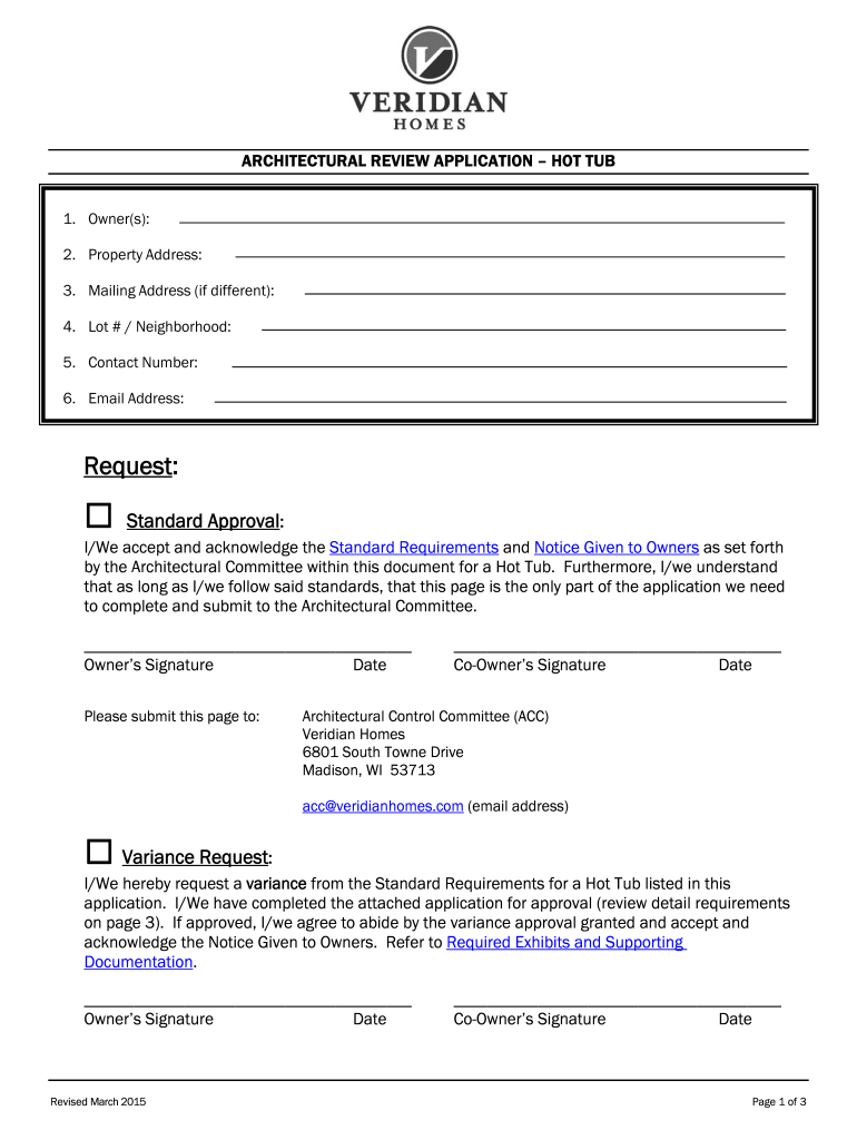ARCHITECTURAL REVIEW APPLICATION HOT TUB 1. Owner(s): 2. Property Address: 3. Mailing Address (if different): 4. Lot # / Neighborhood: 5. Contact Number: 6. Email Address:Request:Standard Approval:I/We