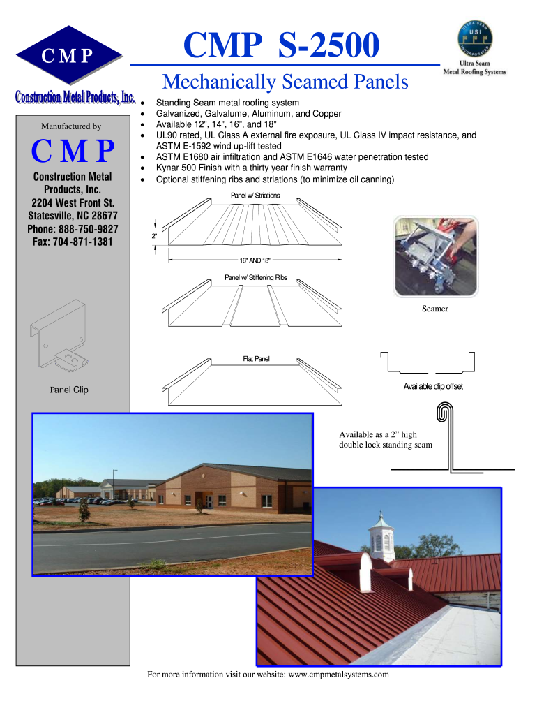 CMP S2500CMPMechanically Seamed Panels Manufactured by CMP Construction Metal Products, Inc. 2204 West Front St. Batesville, NC 28677 Phone: 8887509827 Fax: 7048711381 Standing Seam metal roofing